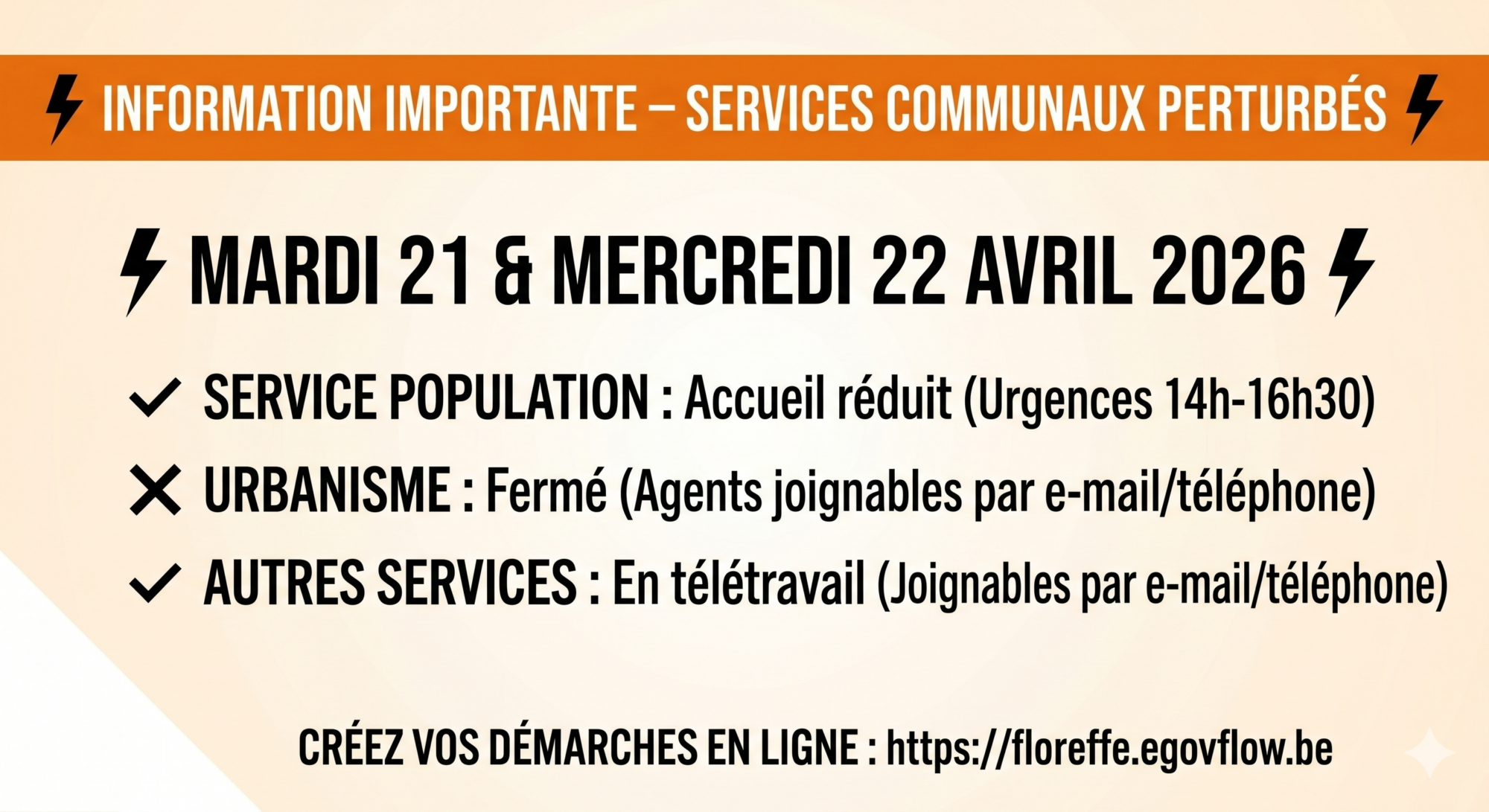 ⚡ Information importante – Perturbation des services communaux (21 & 22 avril) ⚡