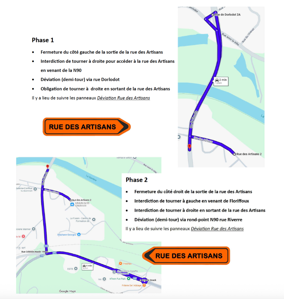 -Une déviation sera mise en place pour le sens Floreffe → Suarlée via la N958, jusqu’à l’îlot directionnel de la rue de Dorlodot afin d’effectuer un demi-tour